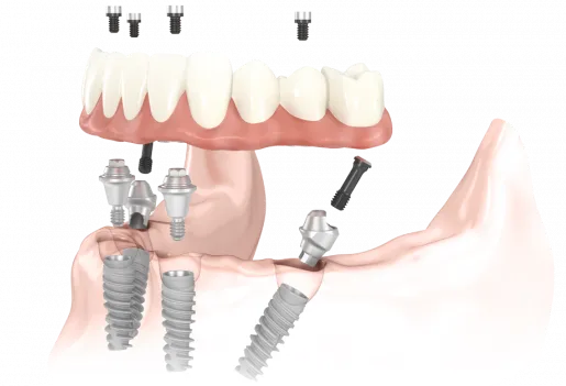 Full arch dental implants provide patients with brand new teeth by utilizing a permanent, titanium-reinforced bridge that can be secured with four to six dental implants. This allows us the flexibility to strategically place the implants in the areas in which the bone is most dense, reducing our need for bone grafting and other supporting treatments. Please keep in mind that we can help people in nearly any situation because of our team approach to Full Mouth Implant Cases.